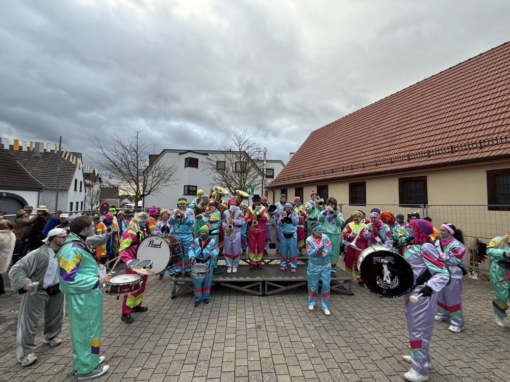 Nach dem Umzug hatten wir Besuch von den Guggenmusiken „Transpiratio" aus Bruchsal, den „Stobblhobblä" aus Forst und den Lokalmatadoren, den „Hardtseegugga" aus Ubstadt-Weiher, die alle auf dem Keltervorplatz noch mal kräftig einheizten. Auch unser eigener Auftritt auf der kleinen Showbühne bereitete große Freude.